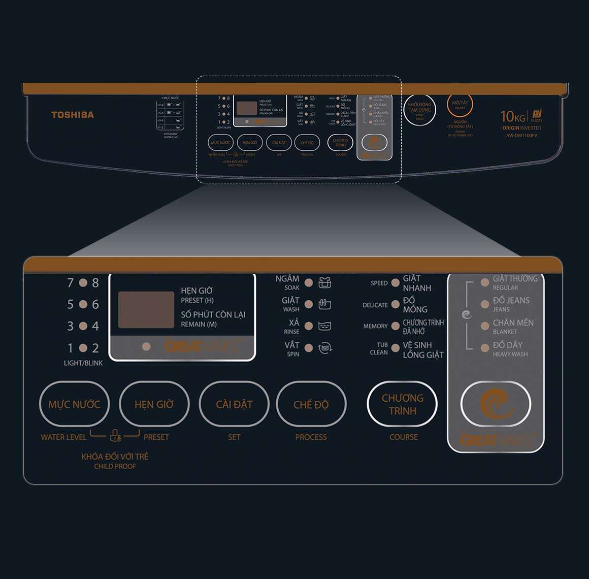 Máy giặt Toshiba AW-DM1100JV(MK) 10kg mang đến cho bạn trải nghiệm giặt sạch vượt trội với Công nghệ Greatwaves. Nhờ vào hệ thống 3 thác nước mạnh mẽ và những tia nước tinh tế từ lỗ phun nước, Máy giặt Toshiba AW-DM1100JV(MK) 10kg tạo ra 3 luồng nước cực kỳ hiệu quả để loại bỏ mọi vết bẩn khó nhằn, mang lại cho bạn những bộ quần áo sạch bóng, thơm mát.
