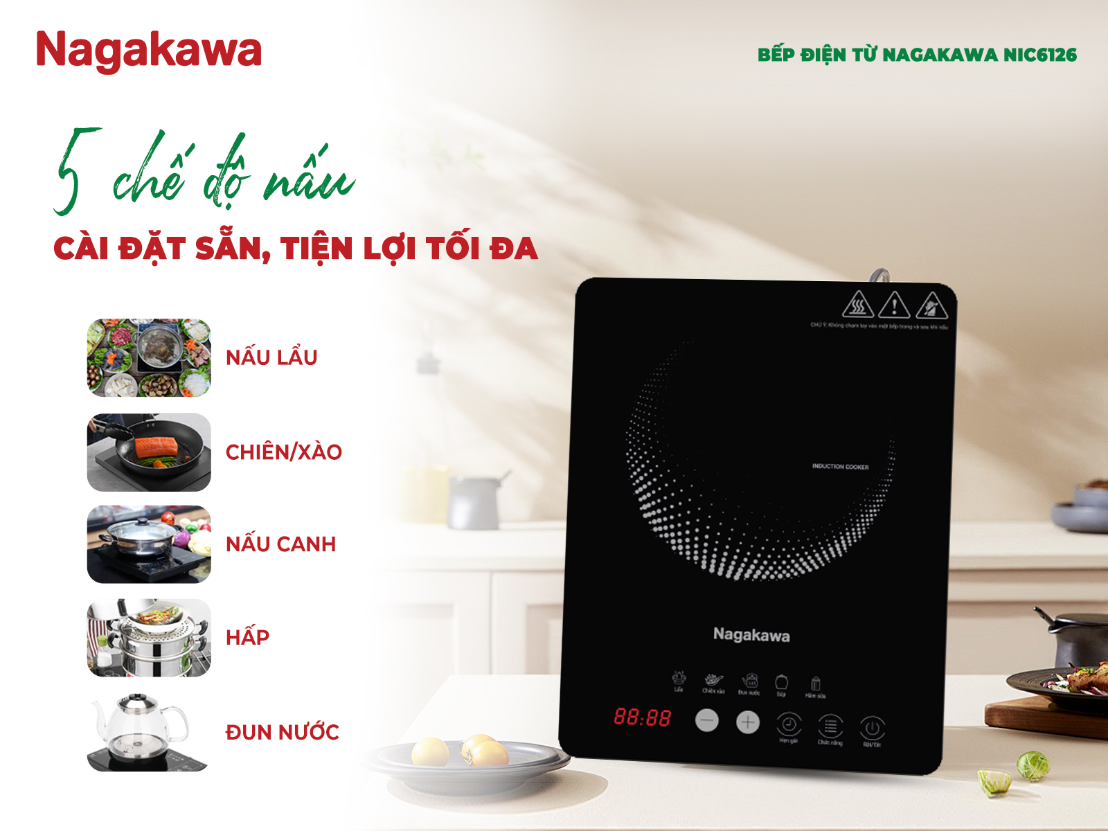 Từ món Á đậm đà đến món Âu tinh tế, Nagakawa NIC6126 đều có thể đáp ứng. Với 5 chế độ nấu được cài đặt sẵn bao gồm: Nấu lẩu, chiên/xào, nấu canh, hấp, đun nước, bạn sẽ dễ dàng chế biến đa dạng các món ăn chỉ với một vài thao tác đơn giản trên bảng điều khiển.