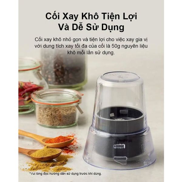 - Cối nhỏ xay được tối đa 50g (đồ khô)/200 ml (đồ ướt) tiện xay các loại hạt, gia vị như tiêu, tỏi, ớt,...