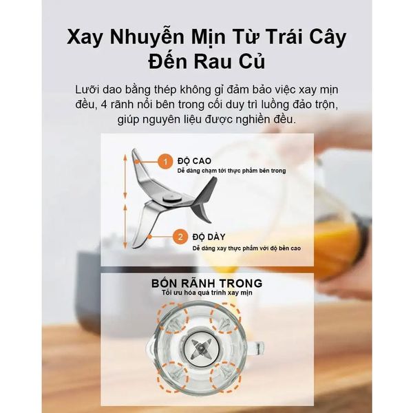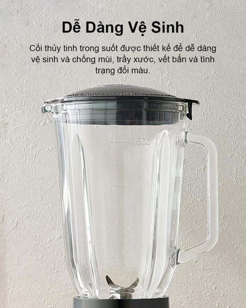 Máy xay sinh tố cối thủy tinh với dung tích 1.5L là lựa chọn lý tưởng cho máy xay sinh tố cho gia đình. Chất liệu thủy tinh cao cấp trong suốt, chống trầy xước, hạn chế bám mùi, và dễ vệ sinh, đảm bảo an toàn thực phẩm và nâng tầm thẩm mỹ cho gian bếp.